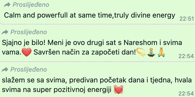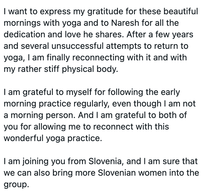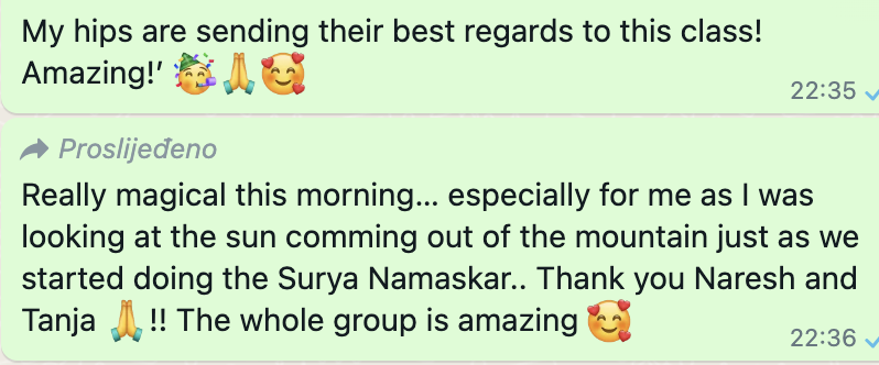 Od početka 2025. predano provodimo Jutarnju Sadhana praksu: Yogu, Pranayame, Mantre i Mudre sa izvornim indijskim yoga masterima i učiteljima. Grupa je velika, sad nas je već preko 40. Cijela grupa je iznimno podržavajuća i motivirajuća, a učitelji autentični. Indijski učitelji rijetko vode Yoga Praksu online, i ovo je iznimna prilika – pristali su voditi cjelovitu Yoga Praksu svako jutro samo za nas iz AyuGardena. I sve to po vrlo pristupačnoj cijeni za našu grupu. Ne propustite ovu jedinstvenu priliku! Uz AyuGarden preparate, yoga praksa, pranayame i meditacija dio su cjelovitog stila života koji vodi u zdravlje, harmoniju i svjesnost.
