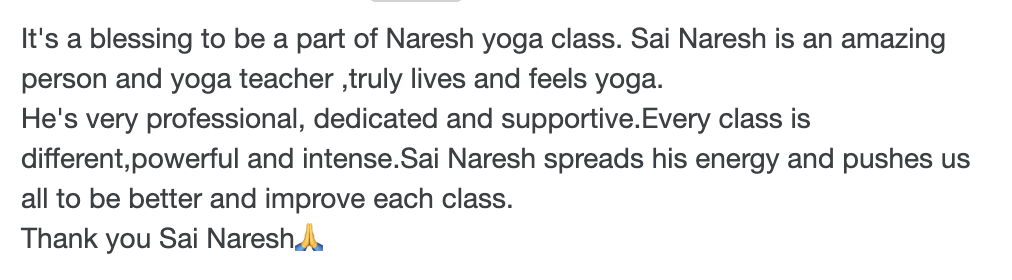 Sai Naresh osnivač je i glavni učitelj yoge u Lalitha Yoga Academy (LYA) u Varkali, Kerala, India. Rođen je i odrastao u Puttaparthiju, važnom duhovnom mjestu u Indiji, poznatom kao rodnom mjestu Bhagawana Sri Sathya Sai Babe. Sai Naresh je započeo svoj Put Yoge 2016. kao učitelj meditacije, a zatim je nastavio održavati certificirane Yoga Teacher Trening Programe koji uključuju Hatha jogu, Yin jogu, Ashtanga Vinyasu i Vinyasa Flow. Trenutno podučava i prakticira Multi-style jogu.