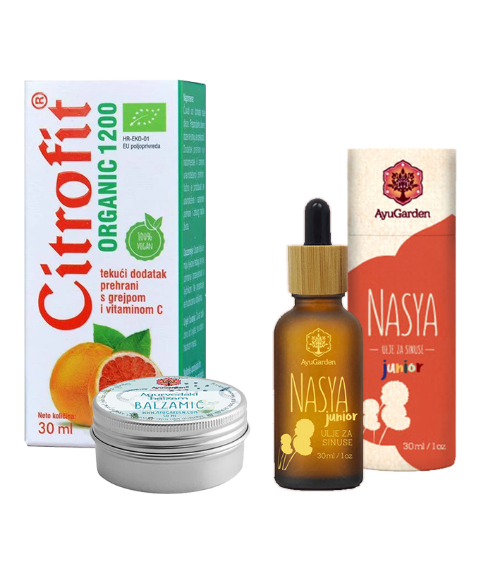 AyuGarden je kreirao pakete za djecu (i odrasle) koje drevna Ayurveda koristi za olakšavanje problema sa začepljenim dišnim putevima, virozama, sinusima, alergijama, glavoboljama i migrenama. Cjelovitim pristupom uz naše poznato NASYA ulje, Balzamić, CHAI TULSI Premium, AyuBreathe Premium, SITOPALADI Premium (kombinacija biljaka koja ublažava sve vrste kašlja), te NETI posudicu možete postići maksimalan učinak.